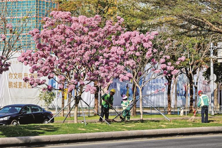 近日,龙华街头的紫花风铃木花朵竞相开放,一簇簇粉紫色的花朵缀满枝头,美不胜收。浪漫的粉紫色花球也让街头多了几分热闹与喜庆,为龙华增添了别样年味。