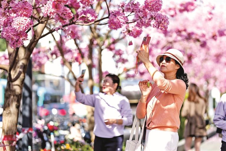 在东环二路ICO花漾街区,数十株长势良好的紫花风铃木恰逢花期,粉紫色的花球灿然绽放,街头成了浪漫的粉色花海。见此美景,不少市民驻足流连,欣赏之余还不忘拿出手机将美景定格,也有不少人站在花海下拍照打卡,留下美美的纪念照。