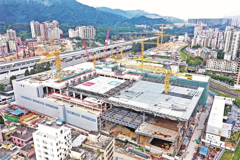 大浪体育中心施工现场呈现出一派繁忙景象。