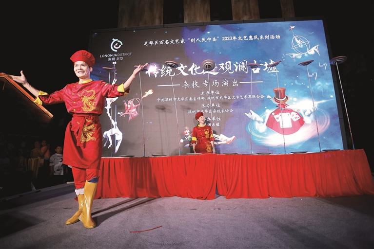 7月14日晚,由区委宣传部、区文学艺术界联合会主办,区杂技家协会承办,观澜古墟协办的龙华区百名文艺家“到人民中去”2023年文艺惠民系列活动之传统文化进观澜古墟杂技专场演出在观澜古墟举办,多位青年艺术家、杂技骨干成员用精湛的杂技“征服”台下观众,把欢乐带给市民。