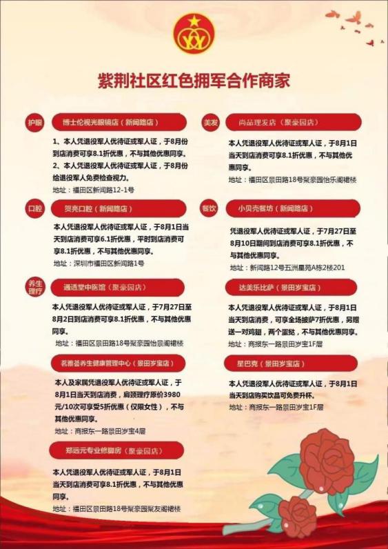 “支持‘双拥’工作是我们履行责任、回馈社会的一种方式。”贺亮口腔的负责人说。据了解,紫荆社区在走访企业的过程中,不少单位表示十分支持“双拥”工作,并主动提出为退役军人提供实实在在的优待。经过近两周的深入走访调研,目前辖区有9家共建单位参与到优惠项目,将于8月1日当天为退役军人提供优待优惠活动。