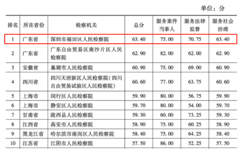 经过中国社会科学院国家法治指数研究中心项目组在以往年度测评基础上,继续对人民检察院的检务公开工作开展指数评估,深圳市福田区人民检察院从124家基层检察院及3家自贸区检察院中脱颖而出,再创佳绩,从去年“全国第七”跃升至今年“全国第一”!