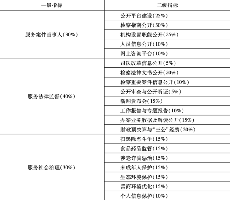 据悉,基于以往多年评估实践,项目组借鉴中国政府透明度、中国司法透明度等法治指数评估项目的经验做法,对此次评估指标进行了较大幅度的调整,围绕服务案件当事人、服务法律监督和服务社会治理3项一级指标开展指数评估。具体的评估指标体系如下: