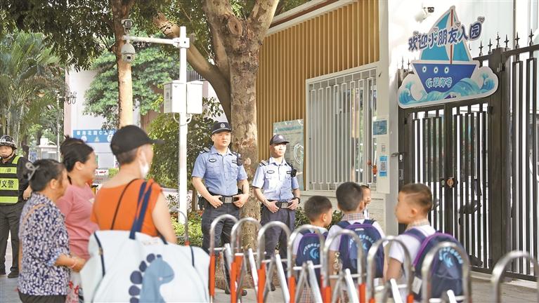 这个学期,龙岗区木棉湾学校、木棉湾第二幼儿园的家长们发现,原本学校门口人车混行的现象没有了,因学生上学和成年人上班高峰重叠而带来的校园周边狭小道路拥堵的问题也得到解决。现在,交警划设出的“临时交通管理护航区”,让师生家长的安全感变得可视可感。深圳公安积极回应社会关切,主动服务师生家长,于本学期在全市各学校展开“护校安园”行动和校园交通“微治理”,组织警力深入辖区所有中小学、幼儿园及其周边区域开展巡逻防控、交通疏导,做到“一校一策”,保障240万名学子上下学平安有序。“我们师生的校外安全,公安部门起了很关键的作用。每天上学放学民警们穿着制服站在校门口,为孩子和家长带来满满的安全感。”福田区石厦学校校长王明慧为校园见警率高点赞。