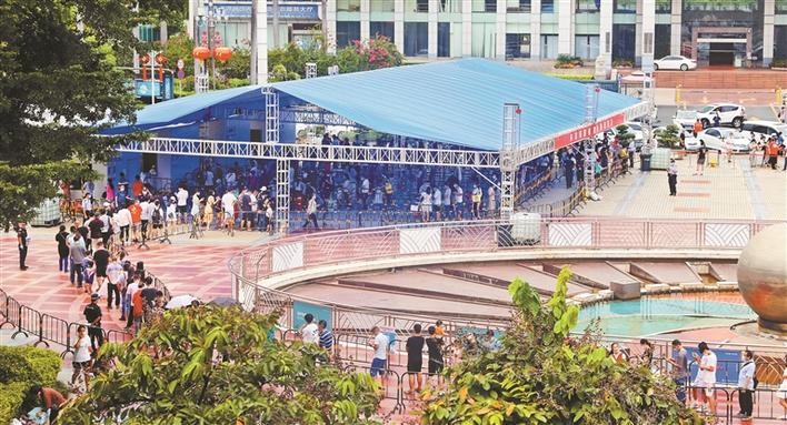 没有树荫的梅林文化广场上搭了十几个遮阳棚,广场上的喇叭循环播放提醒着市民提前扫码,出入口和公园小道上均有义警和工作人员引导、维持秩序。虽然排队的人多,但大家都能有序排队,耐心等候。“检测既能预防感染风险,也让自己安心。”一位上班族小伙说。
