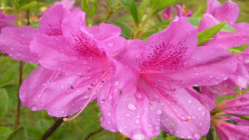 Rhododendron × pulchrum has a purplish-red corolla, in the shape of a broad funnel. The branches and leaves are dispersed and beautiful as well.