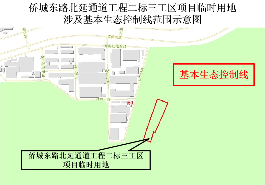 本次申请的临时用地位于南山区桃源街道,南坪快速西北侧,红花四路东南侧,临时用地面积约0.9366公顷,全部位于基本生态控制线范围内(详见附件)。