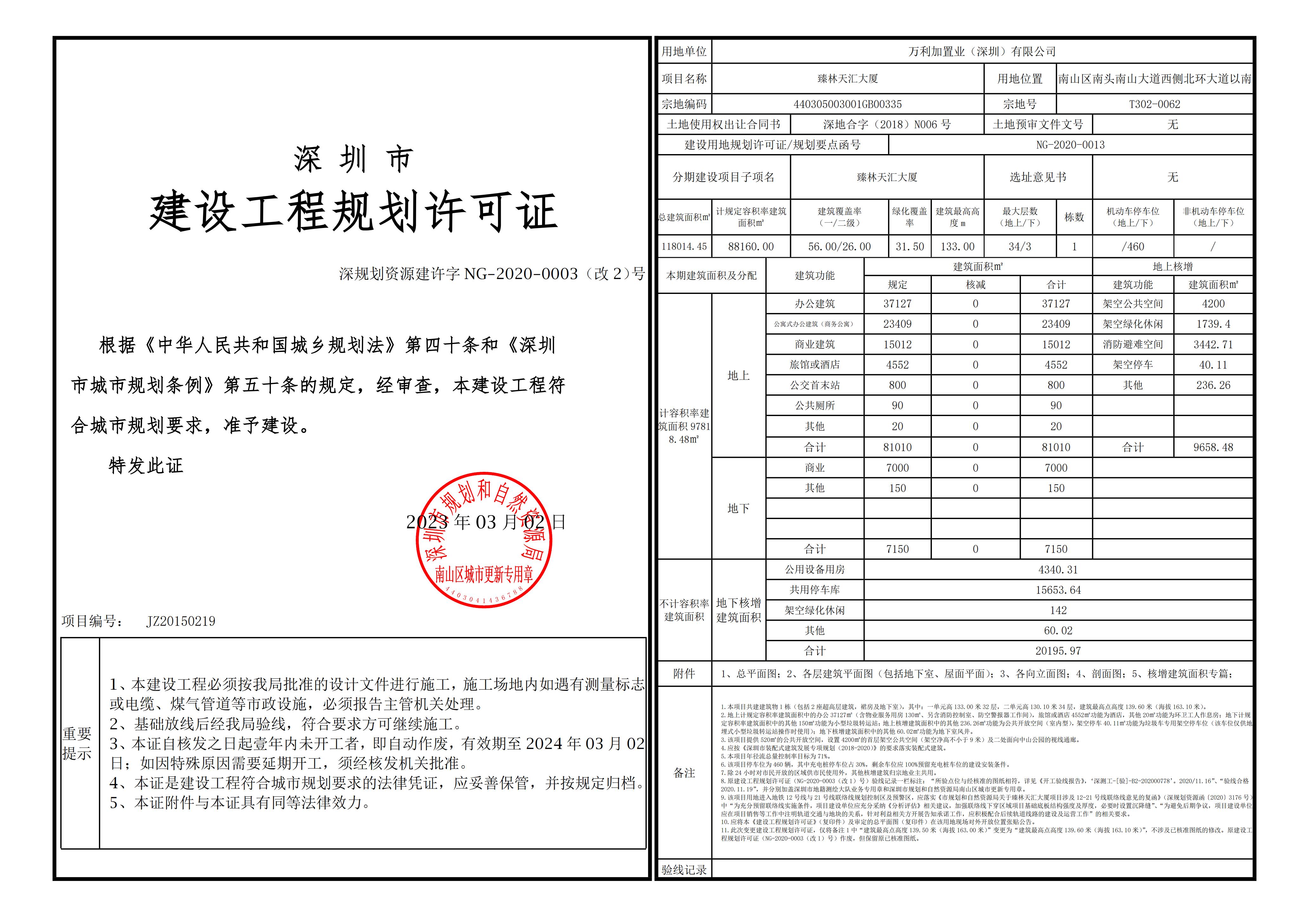经我局审查,同意核发变更后的该项目《建设工程规划许可证》【深规划资源建许字NG-2020-0003(改2)号】。根据《中华人民共和国城乡规划法》第四十条的规定,现将臻林天汇大厦项目变更后的《建设工程规划许可证》及总平面图予以公告。