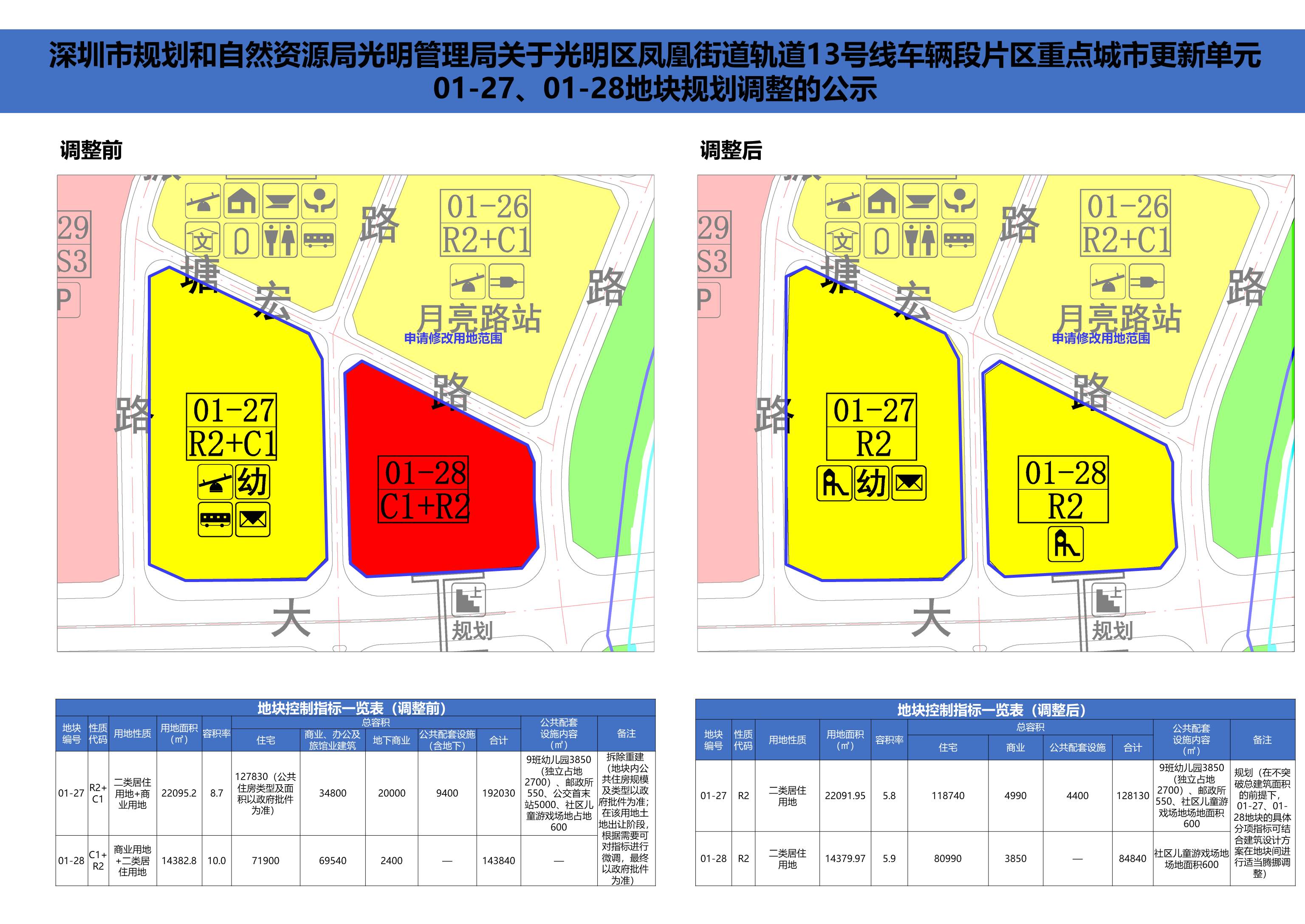 为加快招拍挂出让工作,拟对光明区轨道13号线车辆段片区重点城市更新单元01-27、01-28地块进行规划调整。该事项已经规划主管部门审议通过,现依据《中华人民共和国城乡规划法》和《深圳市城市规划条例》等相关规定,对该规划调整事项公示如下: