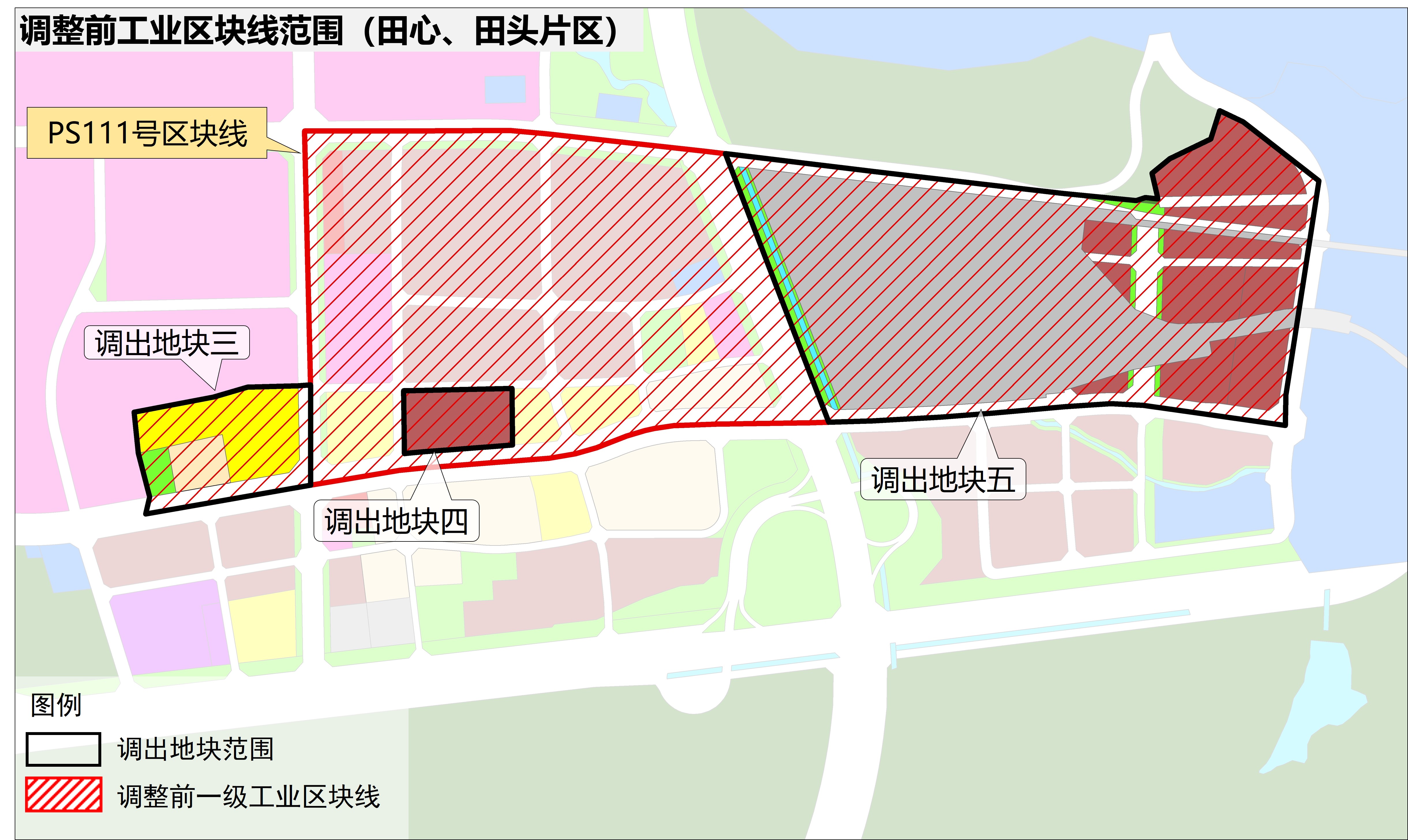 调出地块一位于坪山区坑梓街道,沈海高速、秀沙路交汇路口,面积12.06公顷,其中法定图则规划发展备用地(工业导向)面积7.6公顷;调出地块二位于坪山区坑梓街道,坪山大道、田脚纵路交汇路口,面积4.05公顷,其中法定图则规划工业用地面积3.48公顷;调出地块三位于坪山区石井街道,金田路、创景南路交汇路口,面积6.14公顷,法定图则规划为二类居住用地、四类居住用地、公共绿地及道路用地;调出地块四位于坪山区石井街道,金田路、马鞍岭路交汇路口,面积2.22公顷,其中法定图则规划工业用地面积2.22公顷;调出地块五位于坪山区石井街道,外环高速、兴田路、新联路、兰田路围合区域,面积44.16公顷,其中法定图则规划工业用地面积10.53公顷。