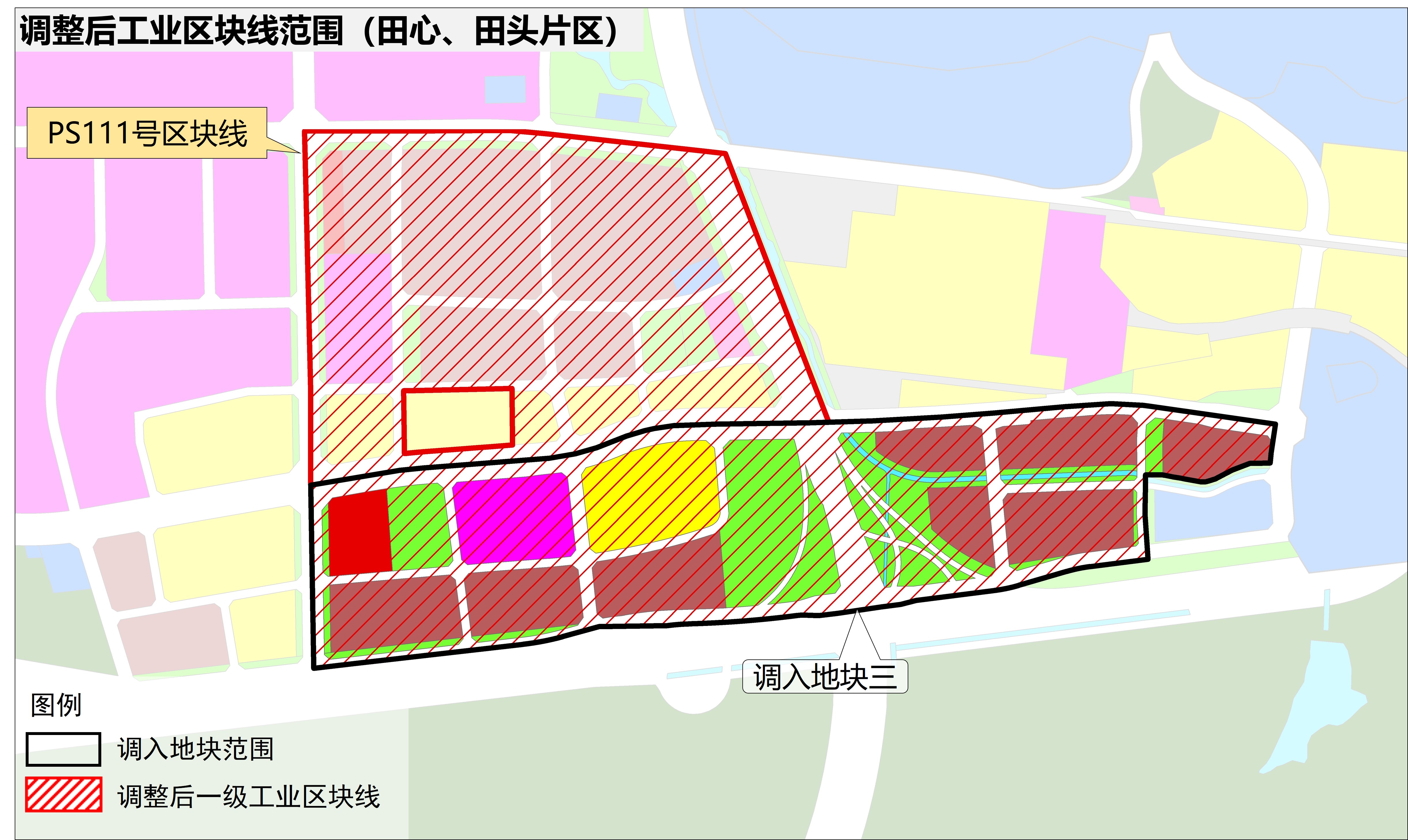 调入地块一位于坪山区坑梓街道,坪山大道、金联路路口,面积5.39公顷,其中法定图则规划工业用地面积3.91公顷;调入地块二位于坪山区坑梓街道,坪山大道以南、丹梓北路东西两侧,面积10.84公顷,根据《坪山区沙田(二期)土地整备利益统筹项目土地整备规划》,其中规划工业用地面积6.9公顷;调入地块三位于坪山区石井街道,金田路-兴田路以南,南坪快速以北,面积55.52公顷,根据《坪山区田心社区整村土地整备利益统筹项目(含树山背)土地整备规划》《坪山区田头土地整备利益统筹项目土地整备规划》,其中规划工业用地面积17.77公顷。