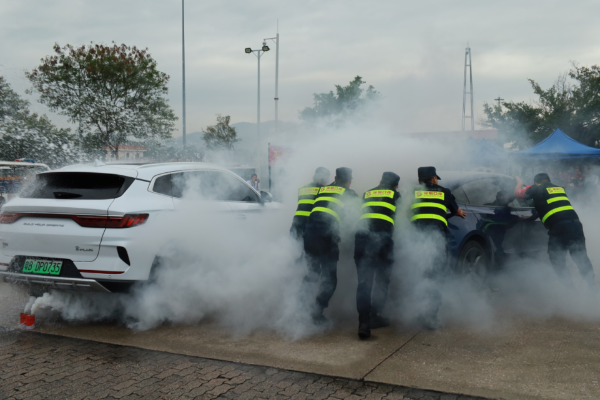 随后迎来了科目二——新能源汽车着火应急处置。科目二模拟新能源汽车突发电池自燃的紧急情况。中控值班人员在视频巡查中敏锐地发现车辆异常,立即按照应急预案进行响应,迅速确认火情并上报至各相关部门。与此同时,为确保周围车辆安全,演练人员迅速行动,利用移车器将旁边一台无法及时联系到车主的车辆安全移出危险区域,安保人员利用就近的消防水带对初期火势进行扑救,有效防止了火势的进一步蔓延。