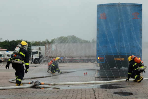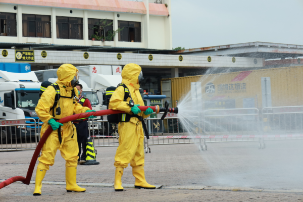 紧接着,进行科目三——危化品泄漏应急处置。该科目模拟了一辆装载二类易燃液体——甲苯稀释剂的入境货车,在入境危化品货台进行海关查验时突发危化品泄漏并伴随冒烟的紧急情况。皇岗海关工作人员凭借敏锐的观察力和专业素养,第一时间发现险情并迅速上报,同时启动应急预案,组织各方力量展开应急处置。消防大队接报后,火速抵达现场,与海关工作人员紧密协作,共同开展处置工作,口岸管养单位现场工作人员也迅速行动,携带吸油毯及沙子等物资,对现场遗留污染物进行妥善处理。最终,在各单位通力合作下,成功控制了险情,解除了潜在的危险。