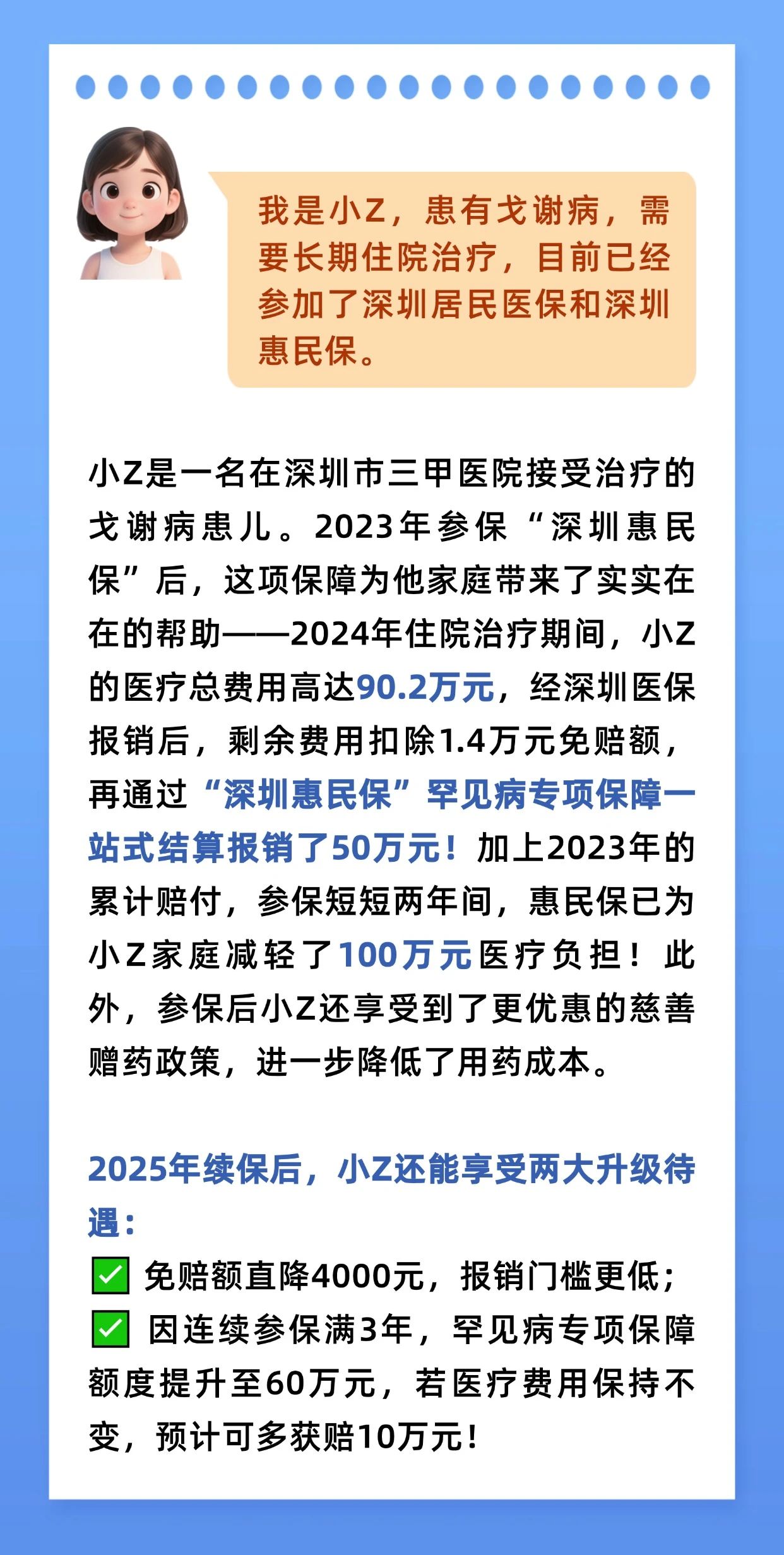 2025年度“深圳惠民保”对罕见病保障再升级,上调罕见病高额自费药品,最高报销额度至60万元/年,提前完成 2025 年深圳民生实事项目要求,进一步减轻罕见病患者用药负担!