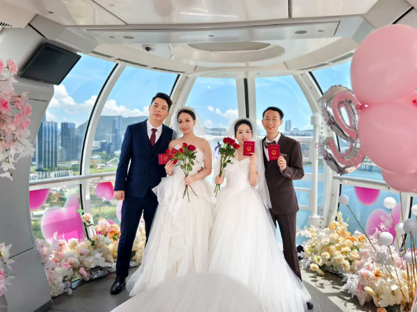开幕式上,现场直播欢乐港湾摩天轮空中浪漫颁证仪式,在摩天轮内设置专属幸运轿厢,在空中为新人们提供颁证服务,用满满的仪式感见证浪漫爱情故事,为新人营造沉浸式的集体颁证体验,助力新人“持证上岗”。