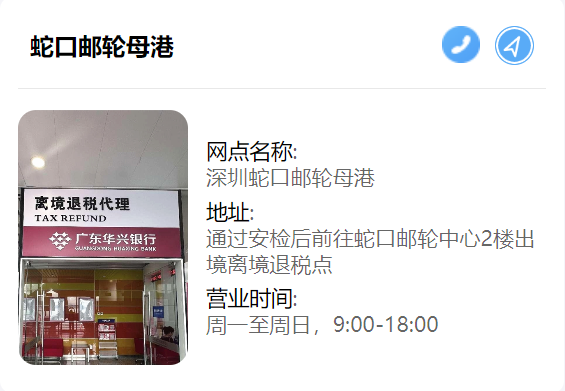 在深圳,目前蛇口邮轮母港、深圳宝安国际机场、文锦渡口岸这三个离境口岸都设置了离境退税代理点,还可以通过“i口岸”小程序中一键查询离境退税相关热点问题。温馨提示:请预留足够的时间办理业务。(信息来源:深圳特区报、深圳市人民政府口岸办公室)