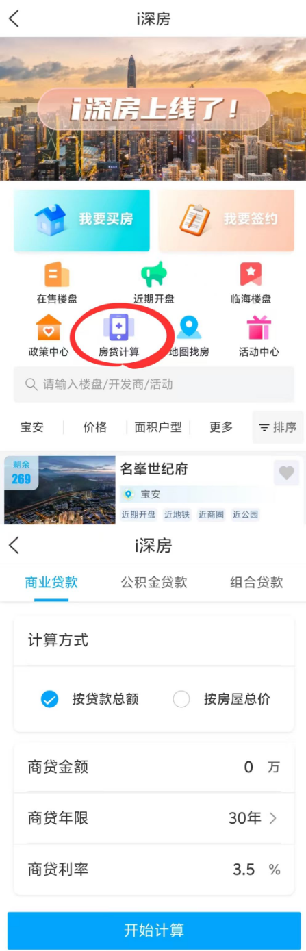 (点击“房贷计算”, 选择贷款类型后,可自动填充房屋备案总价、最低首付比例和房贷利率等关键参数,一键测算月还款额和还款总额)