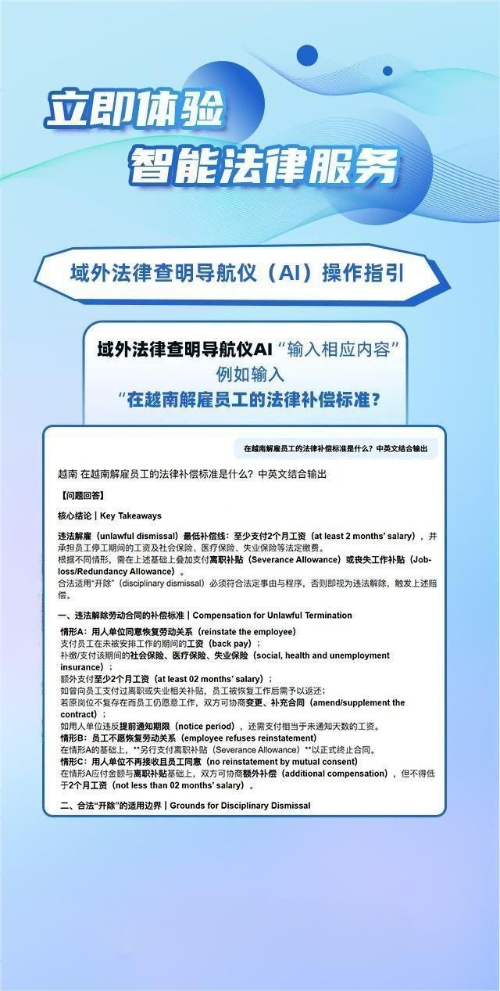 一方面,企业无需依赖境外律师或专业机构,即可自主获取多国法律参考,显著降低法律咨询费用与时间成本;另一方面,系统基于专业解读与官方条文溯源,为海外投资、贸易合作等关键决策提供可靠法律依据,助力企业提升风险预判与应对能力。