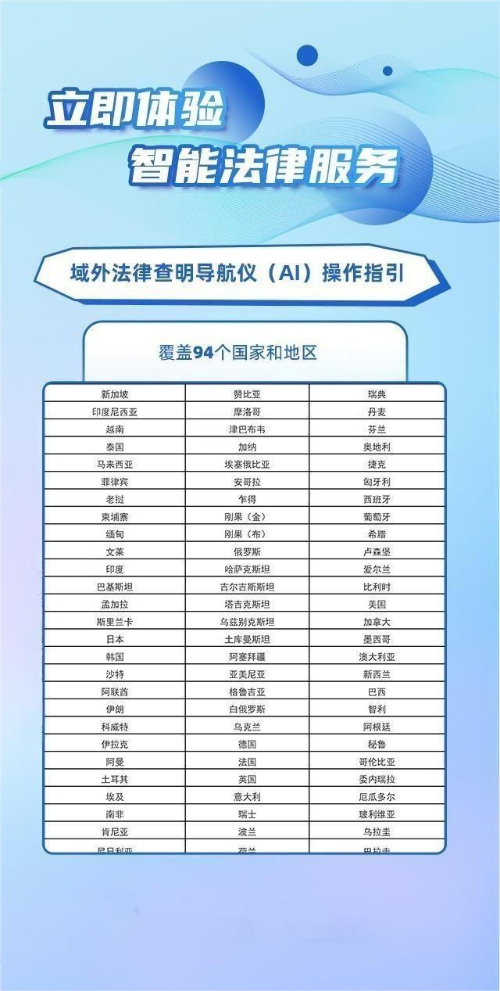 覆盖广且全。已整合全球94个国家和地区的法律法规资源,涵盖主要贸易投资目的地,满足企业跨境业务多场景的法律查询需求;
