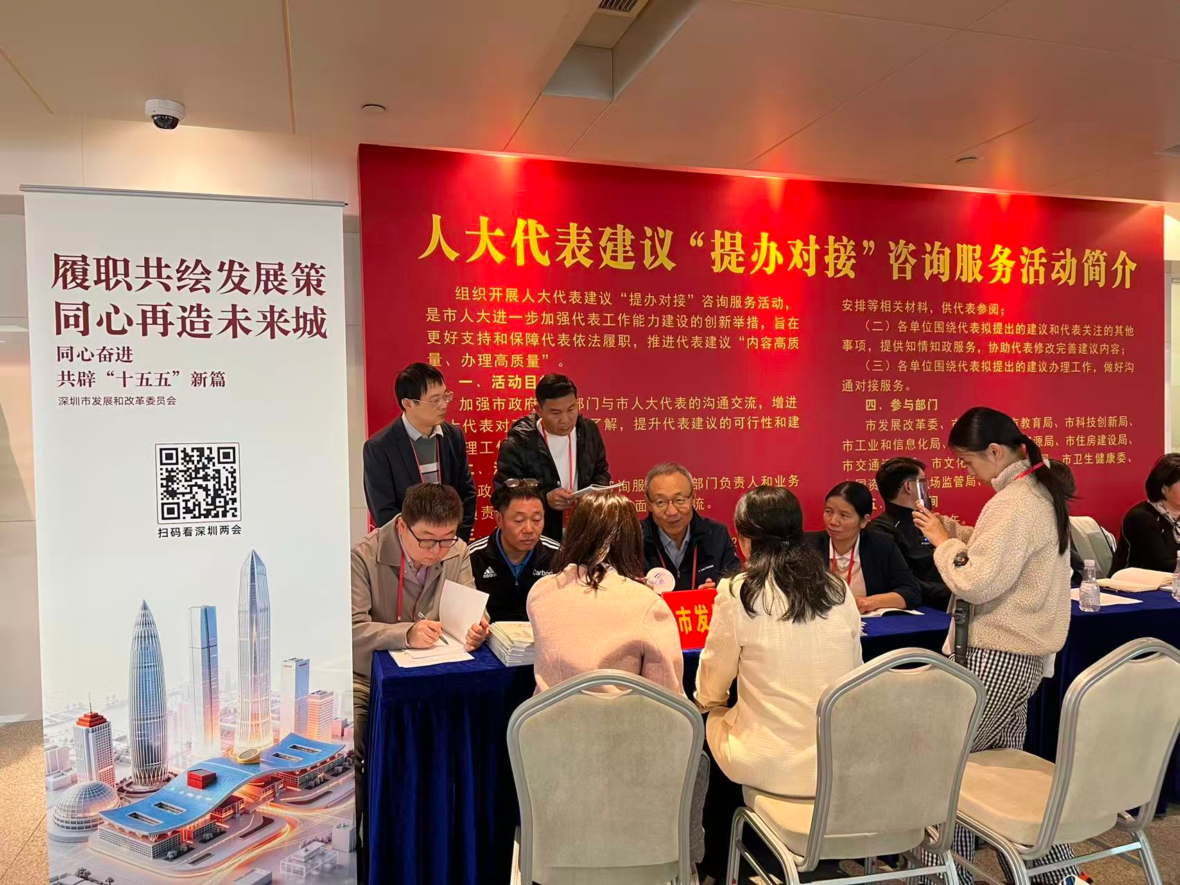 活动现场,我委咨询服务席前气氛热烈、交流活跃。现场准备的《提办对接材料》,2025年发展改革十件大事,2026年深圳市国民经济和社会发展计划、政府投资项目计划、重大项目计划、重点政策解读折页册子及“扫码看两会”宣传栏等深受人大代表欢迎,不少代表现场扫码体验线上宣传内容。活动中,15位人大代表围绕轨道交通规划建设、深惠跨市道路建设、工程服务业高质量发展、积分入户政策优化等提出意见建议,铁军副主任会同相关处室逐一认真回应、详细解答。代表们反馈,相关解答针对性强、内容详实,后续将结合解答内容进一步修改完善建议案,让建议更贴合深圳发展实际、更具可操作性。