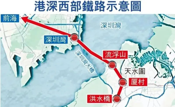 据相关部门透露,港深双方正加快推动港深西部铁路(洪水桥至前海)项目,而广州也正在争取把该铁路延伸到南沙,有望实现香港北部都会区与前海、南沙的直连直通。