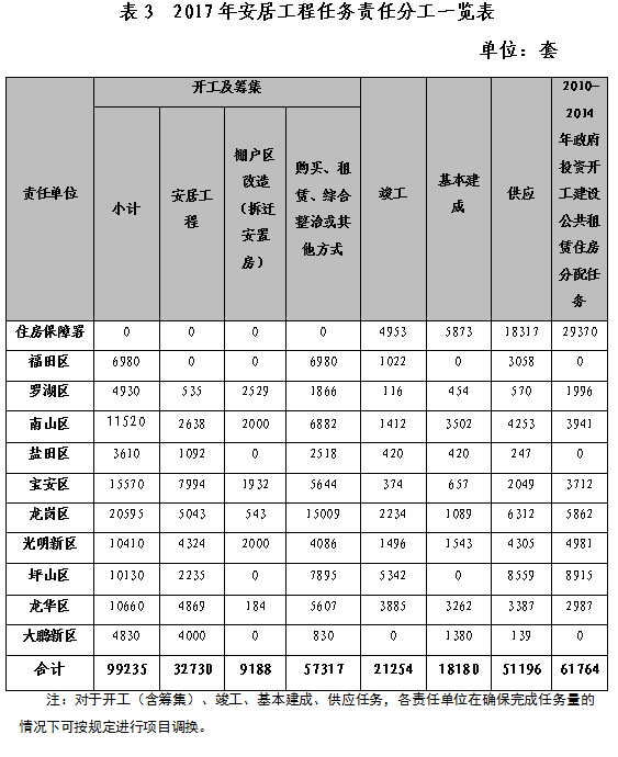 按责任单位分,福田区6980套,罗湖区4930套,南山区 11520套,盐田区3610套,宝安区15570套,龙岗区20595套,光明新区10410套,坪山区10130套,龙华区10660套,大鹏新区4830套。
