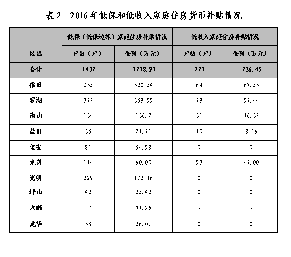 连续10年对全市低保及低保边缘家庭实施应保尽保。2016年,全市发放货币补贴1714户,共计约1455.42万元。其中:低保及低保边缘家庭住房货币补贴1437户,约1218.97万元;低收入住房困难家庭货币补贴277户,约236.45万元。