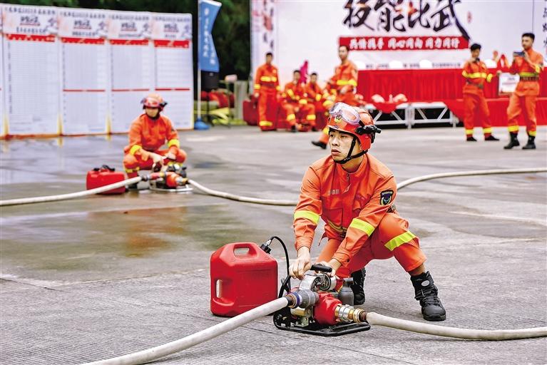 参赛队员参加泵车结合以水灭火项目比赛。