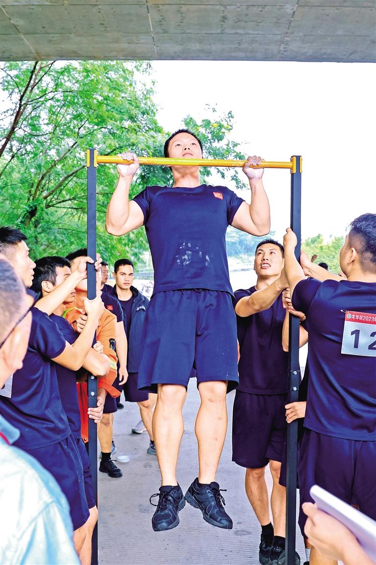 参赛队员参加引体向上项目比赛。