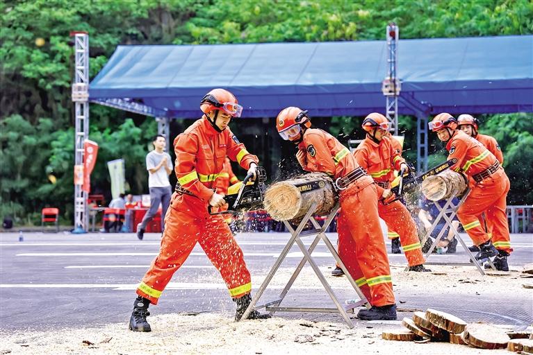 参赛队员参加油锯操作与使用项目比赛。