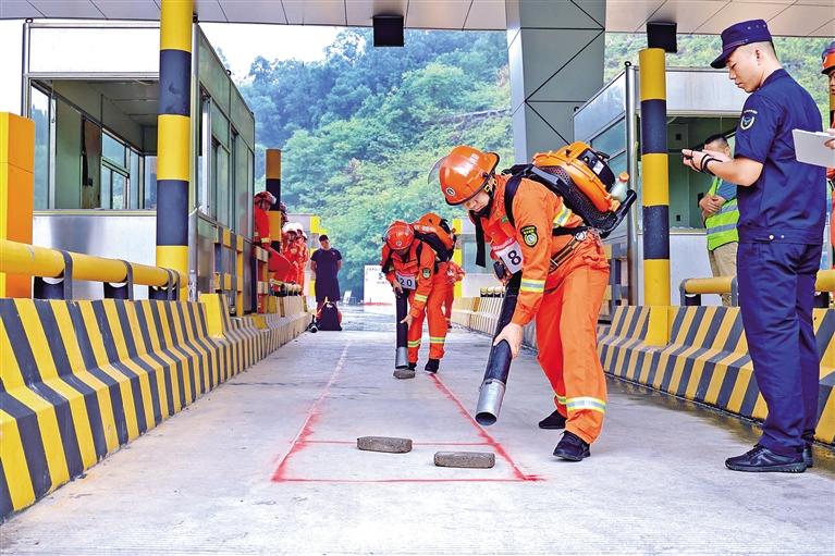 参赛队员参加风力灭火机操作与使用项目比赛。