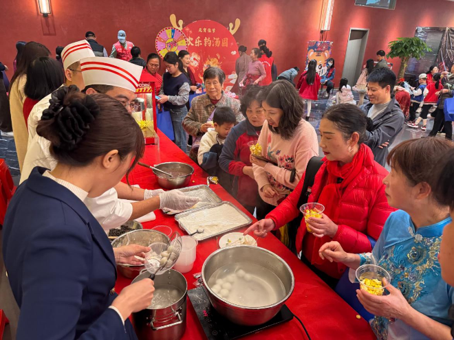 元宵猜灯谜区域人头攒动,五彩的谜面随风飘动,居民们或驻足沉思,或相互讨论,成功解谜后的喜悦溢于言表。投壶游戏处,参与者全神贯注,将箭矢精准投入壶中,引得周围观众阵阵喝彩。钓汤圆游戏处,用特制的“钓竿”钓起带孔的汤圆小纸板看似简单,实则考验了参与者的耐心与技巧。这种新颖有趣的方式,让大家更加深入地感受到了元宵节的传统氛围。夹“元宵”活动处,居民们个个全神贯注,眼睛紧紧盯着乒乓球,手里的筷子灵活地上下翻飞,现场气氛紧张而激烈。现场还设置了汤圆品尝点,安排工作人员煮制汤圆。圆滚滚白胖胖的汤圆在锅中上下翻滚,不一会儿,一个个全飘了起来,香喷喷的汤圆分碗盛出,居民捧着甜滋滋的汤圆,乐呵呵地交流,期盼着整年的团圆。