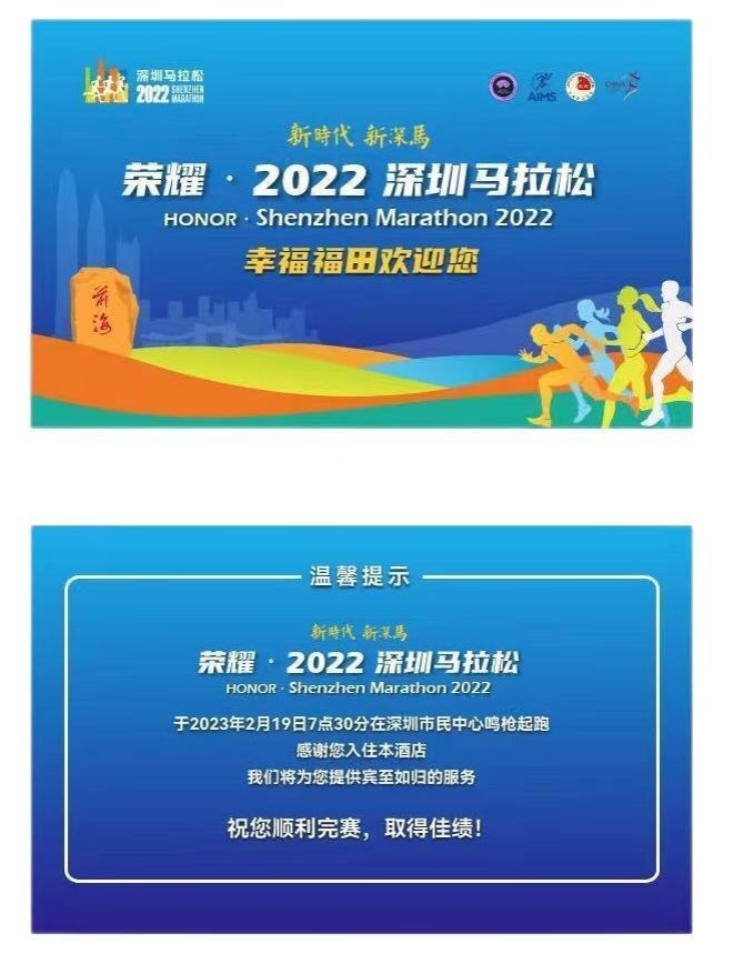 为了使这次比赛参赛者和观众有愉悦、舒适的运动和住宿体验,福田区的各大酒店积极响应福田区文化广电旅游体育局的倡议,主动担当,竭尽全力提供最优质、最有温度的服务。通过在醒目位置张贴《荣耀·2022深圳马拉松-幸福福田欢迎您》宣传海报,对入住选手发放温馨提示卡片,提前供餐等,让参赛者和观众收获满满“圳能量”,尽情感受深圳跃动之美。