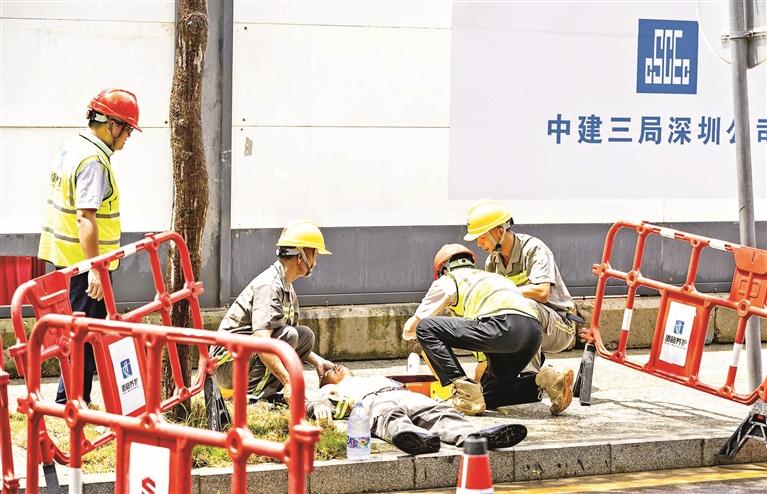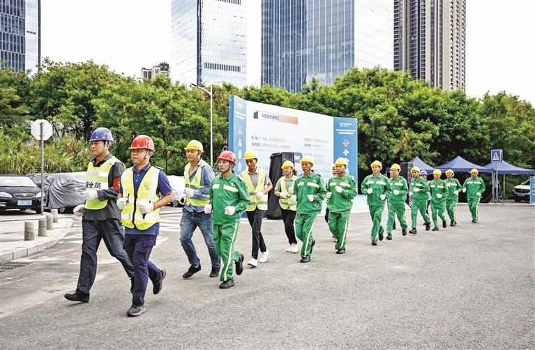 龙华区水务局、深圳市市政工程总公司组织演练队伍展现市政工程施工作业规范场景。