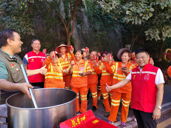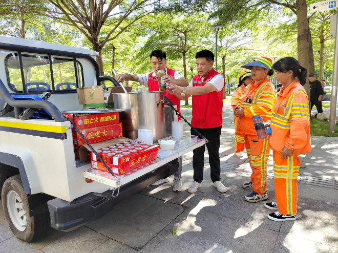 红星志愿者们提醒他们在高温环境下务必注意作业安全和自身健康,避开高温时段的作业,做好防暑降温措施,合理安排作息时间,并感谢高温一线工作者在炎炎夏日仍坚守岗位辛勤劳作。环卫工人接过绿豆糖水和凉茶饮料,脸上露出开心的笑容,笑着说他们将继续尽职尽责,为“美丽莲花”锦上添花。