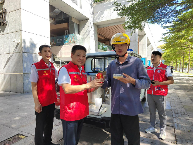 活动现场,莲花街道“老班长工作室”值班班长和退役军人红星志愿者们开启流动车模式,分组到达各社区的道路边,将爱心企业送来的绿豆糖水、凉茶饮料等防暑降温饮品亲手送到环卫工人、建筑工人、外卖员等高温一线工作者手中,当日下午共为60余位高温一线工作者送清凉饮品。