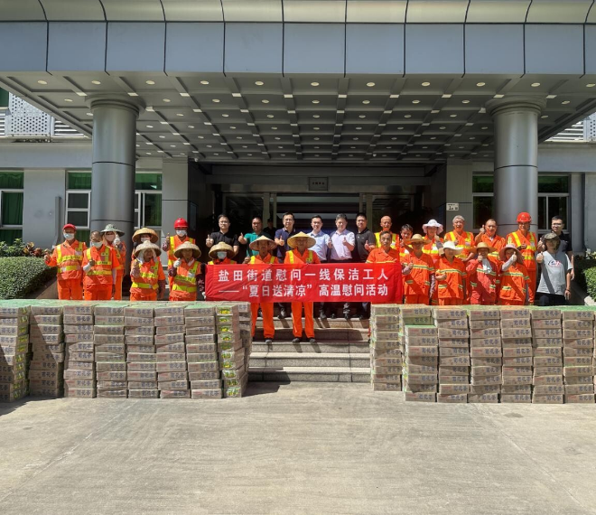 为慰问在夏季高温中坚守岗位的保洁人员和一线巡查人员,7月10日下午,盐田街道开展“夏日送清凉”高温慰问活动,以实际行动关心关爱保洁人员和一线巡查人员的身体健康。街道党工委副书记、办事处主任许思平,党工委委员、城建办主任蔡志恭,执法队队长王国斌,东恒、海山、洁亚公司环卫工人代表参加了此次活动。