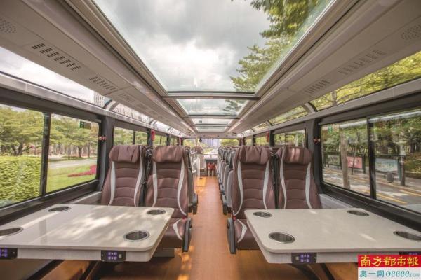 巴士集团在“紫线”投放了3台全新纯电动双层观光巴士,车内配备48座的真皮座椅、7张小方桌,座椅背后及桌角还配置了8种语言的景点播报解说,在车上也能沉浸式了解深圳人文历史,车辆二层采用全景天窗设计,可360度满足市民的观光体验。