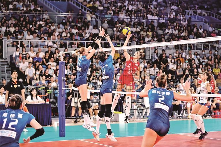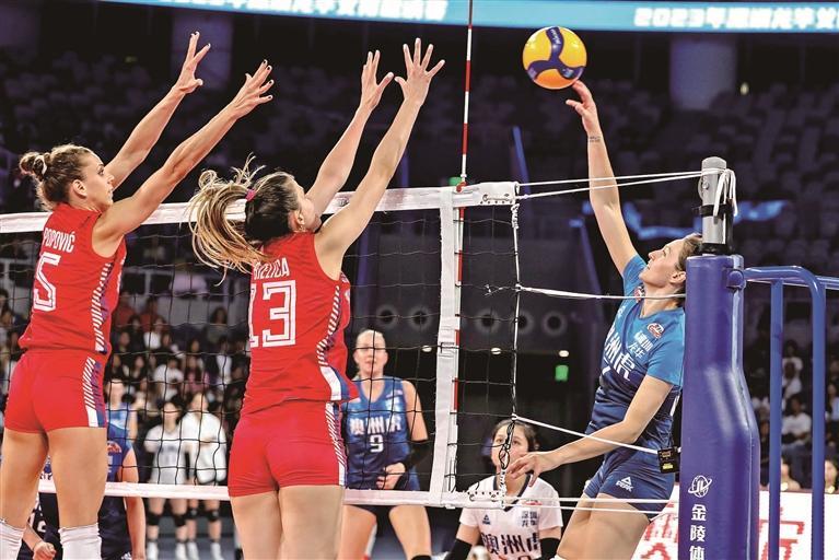 塞尔维亚女排与深圳中塞龙华女排展开激烈对决。