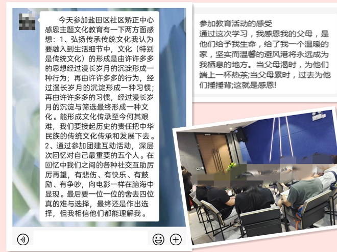 通过此次教育活动,让社区矫正对象在潜移默化中真切感受到传统文化的魅力,自觉传承和弘扬中华优秀传统文化,也告诫其无论何种文化,无论身处何地,感恩精神是普遍的、永恒的,要有感恩之心、有报恩之情、有道德与良心、有正义与责任。