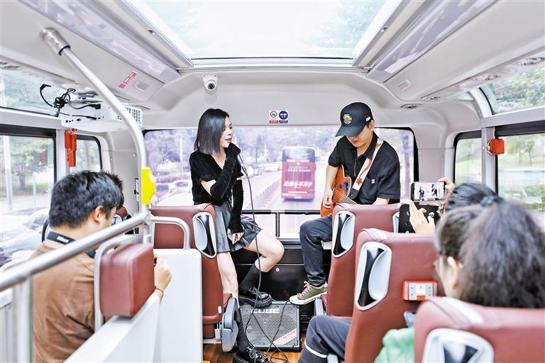 “红胖子”巴士上,乐队为媒体记者带来精彩演唱。