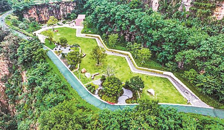 绿道主题景点拼搏岩岭中保留了昔日东荣采石场遗址的崖壁景观。
