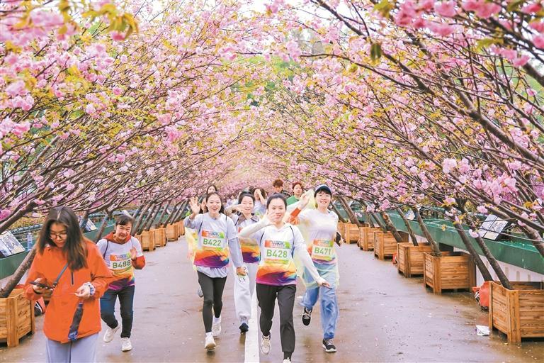 彩虹跑全程5.2公里,相当于一次微型马拉松。好雨知时节,当天,细雨飘至,恰好浸润了跑道两边热情盛开的黄花风铃木和亭亭玉立的粉樱花,让春花开得格外明艳夺目。赏花且竞速,彩虹跑竞技组职工打头阵,闲庭信步组职工随后。从观澜湖大地生态艺术园出发,途经水天一色、风景迷人的森林素拓区、跨湖栈道、滨水栈道、樱木花道、水库大坝……来自全区各行各业的女职工和运动爱好者一起,精神饱满、意气风发,沿着牛湖水碧道来了一场酣畅淋漓的“生态跑”“健康跑”。