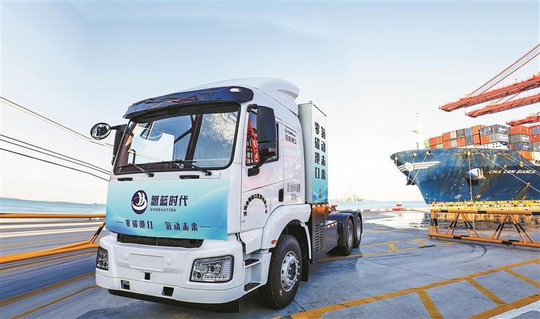 搭载氢蓝时代燃电系统的深圳西部港区氢能集卡。