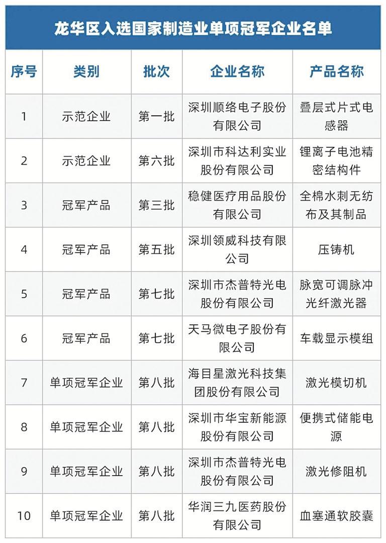 截至目前,龙华区累计有10家企业获评国家制造业单项冠军。