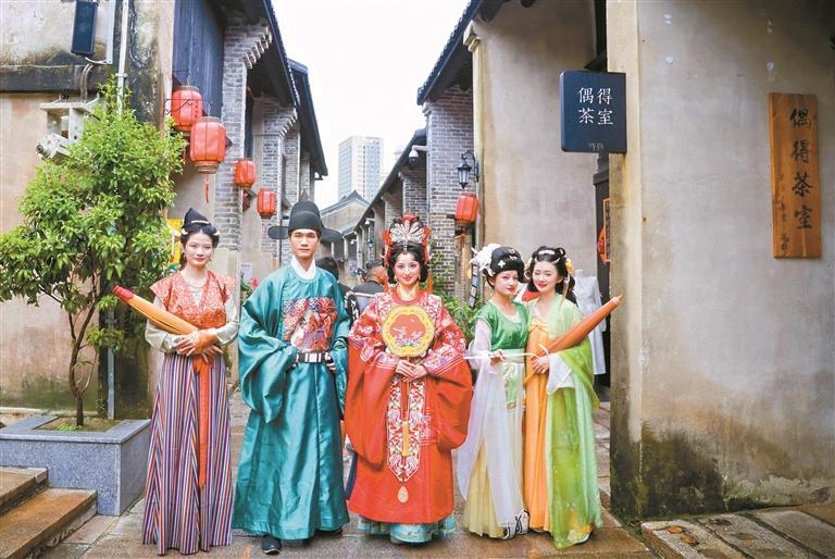 汉服爱好者在观澜古墟巡游。