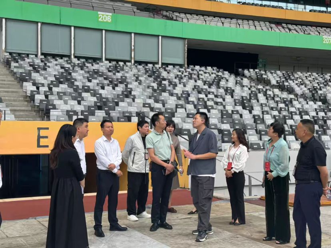考察团一行首先参观了大运体育中心的各个场馆,详细了解了场馆的日常运营、设施维护以及赛事举办情况。据介绍,龙岗大运体育中心位于龙岗区大运深港国际科教城核心区域,是一座集文体场馆、公共服务设施及商业配套于一体的现代化体育综合体。该体育中心不仅承担着举办各类国际国内体育赛事的重任,还具备完善的训练设施,为运动员提供了一流的训练环境。