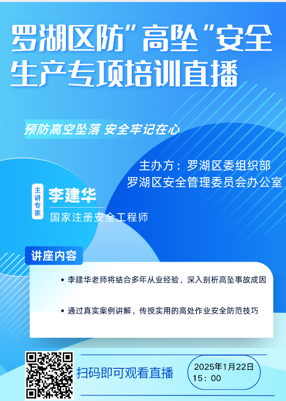 为进一步提升辖区党员干部群众安全意识和安全防范技能,增强防范化解风险的本领,2025年1月22日下午,罗湖区委组织部、区应急管理局联合组织开展了罗湖区防“高坠”安全生产专项培训直播活动。