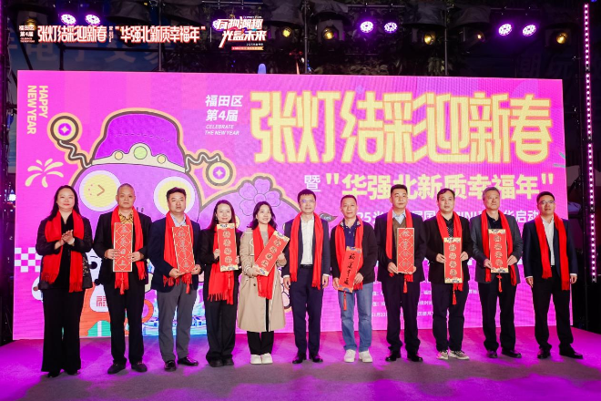 1月22日晚,福田区第四届“张灯结彩迎新春”主题灯会暨“华强北新质幸福年”正式启动。福田区委书记黄伟,福田区委常委、宣传部部长、二级巡视员章海蓉,区委常委、区委区府办主任邓俊为华强北商圈30余位企业家代表送上新春祝福。