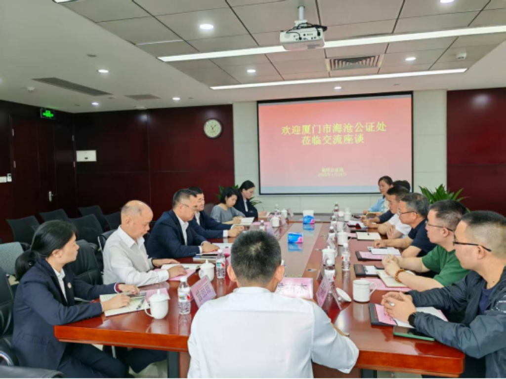 近日,厦门市海沧区司法局局长黄国庆率队莅临盐田公证处调研交流,盐田区司法局局长余永弘、盐田公证处主任梅利斌等陪同调研。